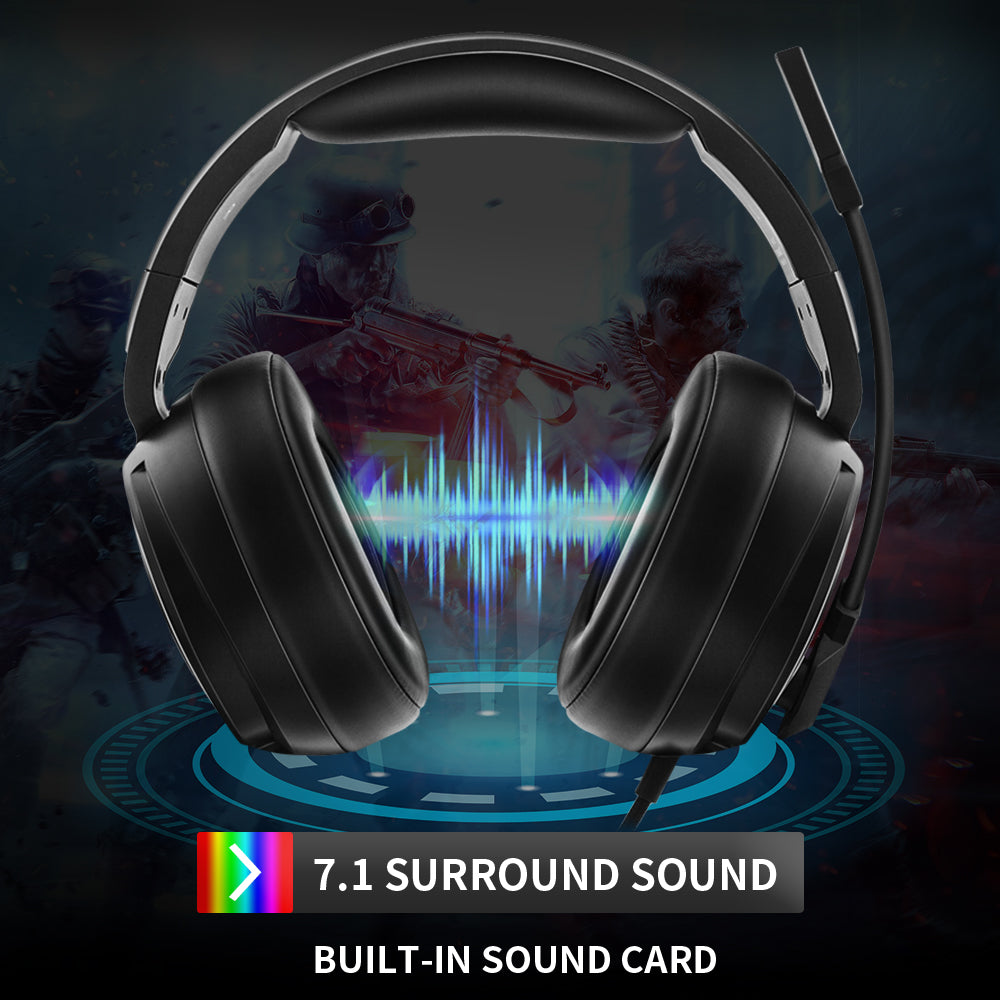 USB PC headset with 7.1 virtual surround, noise‑cancelling mic, memory‑foam pads, and RGB lighting.